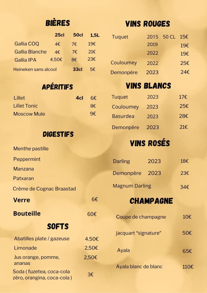 Au menu, découvrez une sélection exquise de charcuteries et de viandes issues du Pays Basque, sublimées par le savoir-faire de Pierre Oteiza, une référence incontestée en matière de gastronomie régionale. Nos alliances ne s’arrêtent pas là : la brasserie Gallia, La maison Lillet, les domaines de la Parrhesia, la maison Ayala, le château Desmonpère, et la conserverie de la Guinguette du Tuquet, dirigée par Eric Banquier, restaurateur émérite et propriétaire des célèbres restaurants « Le Cochons Volant » et « Le Kalimucho », sont autant de partenaires qui enrichissent notre carte de leurs saveurs authentiques.